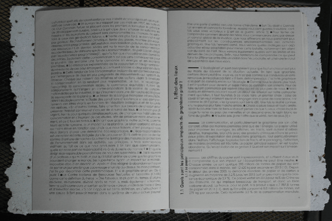 L’ensemble des pages intérieures est imprimé à l’encre végétale, via une imprimante jet d’encre détournée afin d’éviter l’utilisation d’encre industrielle. L’encre n’étant pas stabilisée, elle se détériore avec le temps, ce qui oblige à se séparer de l’objet. Il retourne ainsi à la terre et sert de compost aux graines qui se trouvent dans la couverture. Les images sont imprimées à l’imprimante laser, moins polluante qu’une jet d’encre, et plus avantageuse écologiquement que la risographie pour des petits tirages, car ne nécessitant pas de master. Elles ont été regroupées sur un livret séparé à détacher avant de composter l’édition afin de ne pas mettre d’encre en terre.