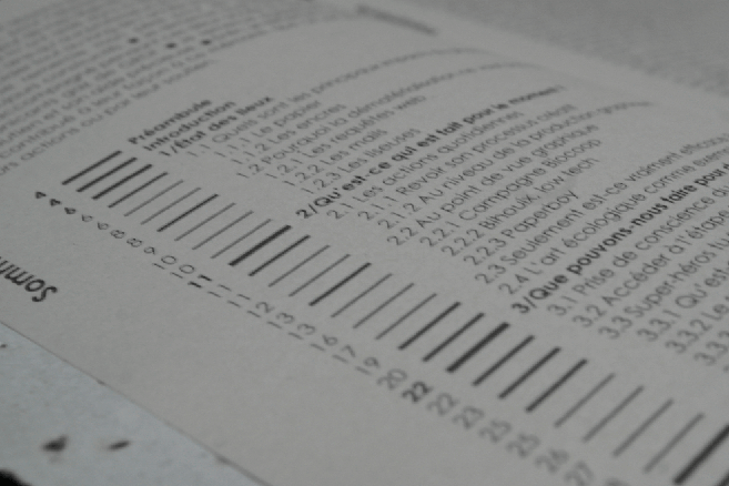 Afin de limiter l’utilisation d’encre végétale, la police choisie est la Century Gothique, qui est la plus économe en encre. Elle consomme 30 % de ressource de moins que la Times, et est même plus écologiqueque certaines polices éco-conçues. Toujours dans le même souci, les textes sont imprimés à 70 % de saturation.
