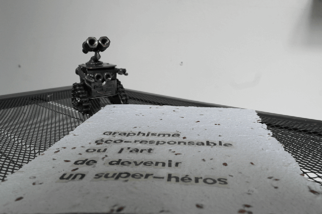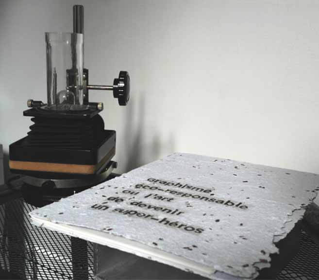 Ainsi, la couverture a été imprimée à l’encre végétale par tampographie, sur un papier recyclé fabriqué à partir des brouillons et des sorties papier des recherches faites dans le cadre de la rédaction. Le processus a été optimisé afin d’utiliser le moins d’eau possible et en bannissant les appareils électriques. Le papier contient des graines, qui se développeront une fois l’ouvrage composté.